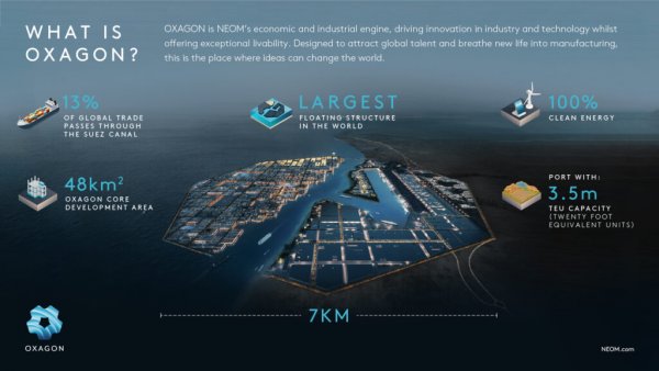 OXAGON与the LINE(于2021年1月宣布)的理念和原则相辅相成,将提供与自然和谐相处的非凡宜居性。OXAGON位于红海,靠近苏伊士运河,全球约13%的贸易通过苏伊士运河,OXAGON将是世界上技术最先进的物流中心之一,拥有最先进的港口和机场连接。